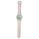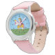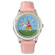 Assista com ilustração de uma garota fofa de vestido rosa cavalgando pônei branco