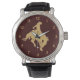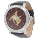 Este relógio mostra o que todos sabem sobre Wyoming. Cavalos e vaqueiros andam! Apresenta uma imagem de vaqueiro dourado e da silhueta de cavalo balançando sobre um fundo castanho escuro. *Este design usa imagem © Graphics Fatory.com*