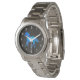 Um relógio feminino com um bonito cavalo aquarela em cores azul e roxo. Colocada sobre uma textura que se parece com um bloco de cinza de carvão de madeira.