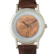 Um belo centro para este elegante relógio, adornada com uma madeira rústica crua com flores gravadas. Muito chique, crua e moderna. Seu monograma está finamente gravado em letras sutis