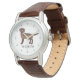 A ilustração original do desenho de Destei de um casaco de cor castanho-chocolate giro Labrador Retriever. Há também uma área de texto personalizável para um nome. A face do relógio é feita de linhas pretas simples.