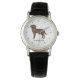 A ilustração original do desenho de Destei de um cão da raça Labrador Retriever de cor castanha de chocolate. Há também uma área de texto personalizável para um nome ou outro texto personalizado. A face do relógio é feita de linhas pretas simples.