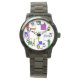 Esse relógio feminino tem um design Bauhaus de linhas indo vertical e horizontalmente para fazer uma grade com quadrados, retângulos, triângulos e círculos colocados em volta da grade. Se você gosta do design, mas prefere cores diferentes, me mande mensagem.
