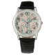 Este relógio masculino tem uma design de círculos decorados com linhas e círculos feitos de pontos repetidos em verde-retrô e coral.
