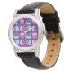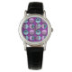 Este relógio tem uma design moderna do século médio de meio-círculos, alguns com estrelas, alguns com pequenos círculos, e alguns apenas sólidos, em azul e roxo.
