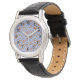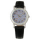 Este relógio feminino tem um design geométrico de círculos em filas com círculos ou ovais dentro em marrom num campo de azul.