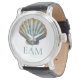 This beautiful monogrammed watch features a coastal scallop seashell in soft watercolor shades of blues and tans. Personalize the monogram with your choice of initials. Fun for personalized gift bags and party favors.