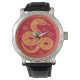 Celebrar o Ano Novo Chinês com este impressionante relógio vermelho e cobra zodiaco dourado. Com um elegante design de cobra rodeado por intrincados motores de nuvens e uma fronteira geométrica tradicional, esse relógio combina lindamente a arte cultural com a funcionalidade moderna. A ousada paleta vermelha e dourada exude festividade e sofisticação, fazer perfeito para honrar o Ano do Cobra ou como um presente pensativo. A fina pulseira de couro preto complementa a face vibrante do relógio, garantindo conforto e estilo.