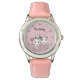 O design do produto apresenta um belo coelho e gatinho com flores cor-de-rosa. Este desenho animado bonito faz um relógio de pulso bonito e único com texto personalizado para crianças.