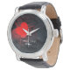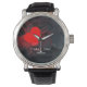 Um relógio marcante com um coração vermelho ousado em um fundo escuro espalhado com pequenos corações, com as palavras apaixonadas "EU TE AMO!" em letras brancas e um nome personalizável abaixo. A maneira perfeita de carregar o amor no seu pulso todos os dias. Ideal para o Dia dos Namorados, aniversários, noivados ou como uma surpresa romântica profunda. Personalize com o seu nome especial! Estojo de prata de alta qualidade com pulseira de couro preta | Movimento de quartzo | Resistente à água