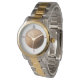 O relógio de tom de ouro e prata é um relógio de cara pequena perfeito para o veste do dia a dia. Ele apresenta um movimento de quartzo em três mãos, resistência à água a 100 pés, e uma pulseira de metal de tom dourado e prateado. Personalize o rosto com seu nome e designs para um relógio personalizado apenas para seu pulso.