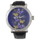Composição de borboletas luxuosas de safira e joias de ouro em fundo azul texturizado.