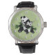 Panda mama senta-se comendo bambu enquanto o bebê faz como o bebê panda vê