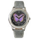 Aqui está um bonito relógio para ela, com a característica central sendo uma incrível imagem roxa e borboleta dourada. O nome dela está em prata abaixo da borboleta, e os números de prata ao redor do perímetro tornam o relógio fácil de ler. Elegante para qualquer pequena princesa!