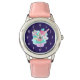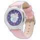 Um relógio com uma ilustração fofinha apresentando um cupcake e sorvete sorrindo de alegria. Um arco-íris e corações rodeiam o desenho. Uma nuvem fofa e fofa também está sorrindo de felicidade. O cupcake e o sorvete têm um trompa de unicórnio em cima. Cheio bonito e adorável de alegria.