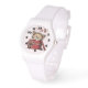 A watch with a cute drawing of a little kitten poking its head out of a gift box.
