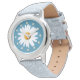 Uma simples margarida sobre um fundo azul. Ele me ama! Pulseiras de relógio reluzentes em vermelho, rosa ou prata.