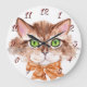 Face aquosa de um gato bonito vestindo um arco laranja. O relógio tem números e também pode ser usado para uma sala para crianças. Obrigados para Creative Fabrica para o design do gato.