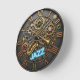 Relógio de Arte Música Jazz exclusivo com Saxofone, Trompete e luz de neon azul com a palavra "jazz" definida dentro do motivo industrial/steampunk com engrenagens e engrenagens em ouro com diamantes, pedras rubis. Relógio fabuloso para músicos, jazz cafe club, patronos, músicos e fãs de música.