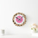 Um relógio com ilustração de um círculo cor-de-rosa no centro. O fundo é o padrão de impressão leopardo. Numerais são cor-de-rosa e pretos. Personalize com seu nome e inicial.