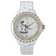 Este relógio mostra um desenho animado de vaca kawaii em um fundo de bolinhas retrô de cinza clara. Se você não gosta da pulseira branca ou das rochas, você pode escolher outra pulseira à direita desta página.