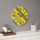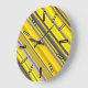 Este design de relógio apresenta um padrão de listras coloridas em vários tons de cores como amarelo e cinza. Também apresenta retângulos que marcam as horas.