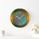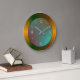 Um relógio de cozinha simples e atraente com reflexos de ouro. Um centro redondo com verde aqua e toques de vermelho. Uma fina borda preta com ponteiros pretos complementam o design. Disponível em formas redondas e quadradas.