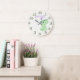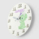 Adicione um nome e título a este adorável relógio de parede de bebê dinossauro (do período jurássico ou idade da pedra). Ideal para um quarto de bebê ou criança pequena com tema de dinossauros, menino ou menina. As cores são tons sutis de cinza e verde turquesa com roxo. Números com aparência de idade da pedra.