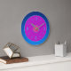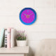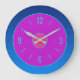 Um lindo relógio de parede em rosa/violeta com uma borda atmosférica azul. Este adorável relógio simplista é adequado para todas as áreas da casa.