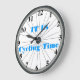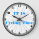 Uma visão lateral de uma roda de bicicleta forma a base para esse relógio de parede, com as palavras "É o tempo de ciclismo" escritas no centro. Essas palavras podem ser personalizadas por você.