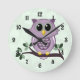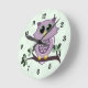 Custom Wall Clock (Relógio de Parede Personalizado) com um design de gráficos vetoriais de uma coruja rosa giro em um galho com folhas e um plano de fundo de padrão floral verde com uma face de relógio de fonte vitoriana.