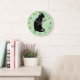 Relógio de Parede de Gato Preto em um fundo de aquarela verde.