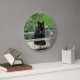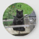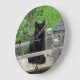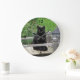 Este belo relógio de parede mostra um gato preto sentado ao lado de uma lâmpada decorativa em uma ponte de madeira. Blackie, o gato, acordar toda manhã e se senta nesta ponte de jardim quando começa seu dia. Um relógio perfeito para todos os amantes de gatos pretos.