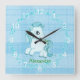 Personalize este relógio de parede impresso com um pônei azul giro em um fundo de xadrez macio para uma criança com seu nome. Disponível em estilo quadrado ou redondo. Criada com trabalho de arte por Angela Wenke em www.resaleclipart.com.