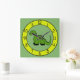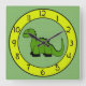 Sombras de verde e amarelo-verde com um grande dinossauro verde em um relógio de parede. Decorando um berçário, um quarto de criança ou um quarto de criança? Um relógio bonito é o acessório perfeito! Este relógio também faria um novo bebê inesquecível ou um novo presente caseiro. Disponível em dois tamanhos de relógio redondo, ou um relógio quadrado. Copyright Scarebaby Design.