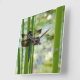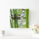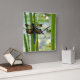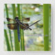 Esta linda fotografia de libélula foi tirada no Jardim Botânico em Grand Junction, Colorado. A libélula está descansando sobre uma grande folha de capim com suas asas estendidas. Seu corpo é azul e suas asas translúcidas são marrons escuros na base e brancas na ponta. Cada asa também tem uma pequena faixa preta na borda superior em direção à ponta. Há várias lâminas de grama verde atrás da libélula e o fundo da fotografia é cheio de água espumante refletindo o sol.