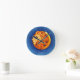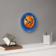 O relógio colorido apresenta fundo azul com um rosto de leão, um símbolo astrológico para Leo.