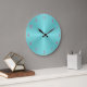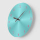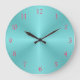 Uma face de relógio iluminada em aqua com numerais rosa profundo. Este relógio de parede liso também está disponível em design quadrado.