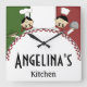 Esta design apresenta um chef baleeiro segurando uma pizza e outro chef segurando uma bandeja de serviço. Estão escondidos atrás de uma placa janta branca, que tem um design de pranchas de xadrez vermelho e branco. Há muito texto personalizável para você personalizar este adorável relógio. Fundo listrado vermelho, branco e verde completa a aparência. Este design é protegido por direitos autorais e não pode ser copiado ou redistribuído. Para obter informações sobre este ou outros designs nesta loja, ou se você precisar de assistência com personalização, use o recurso enviar mensagem anexado a esta loja e ficaremos felizes em ajudar