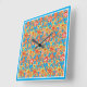 Um relógio de parede quadrado bonito com um padrão de flores vermelhas, laranja, amarelas sobre fundo Turquesa brilhante e borda azul Turquesa, de uma colagem de papel pintada à mão por Judy Adamson. (Coordena-se com a coleção floral laranja, Orange Fizz.)
