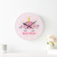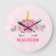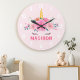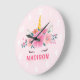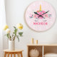 Relógio de Parede Quarto de Meninas Cílios de Unicórnio Fofo. Este design apresenta um belo unicórnio cercado por estrelas douradas e flores florais. Relógio de parede de fantasia mágica rosa pastel para meninas. Personalize este design personalizado com seu próprio nome ou texto.