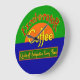 Um relógio de parede engraçado para os produtores de café de escritório com o novo trabalho de arte de etiqueta de café, de aparência vintage, lendo Café Excel-o-rator, Qualidade e Satisfação Todas as Vezes em letras retrorreflectoras.