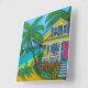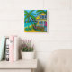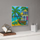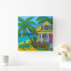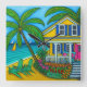 Uma pintura de Lisa Lorenz de uma cena tropical vibrante e abençoada de uma casa de praia colorida e aconchegante ao longo de uma praia de areia à beira-mar turquesa. Agora disponível em um relógio de parede elegante.