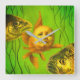 Este relógio é ilustrado com um bebê mutante de peixe dourado assustado com dois peixes malvados de ambos os lados.