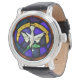 Este relógio foi desenhado com uma foto de uma janela de vidro manchado com uma pomba branca e um cartaz dizendo, "Abençoados são os Criadores da Paz".