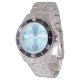 Este relógio personalizado combina força+feminilidade - como você! A face do relógio apresenta uma pintura digital original de uma mandala graciosa e curvada, pintada com gradientes de aqua a teal, contra um fundo azul e branco de pínus. Mostrada com uma pulseira branca esmaltada, de aço inoxidável.