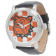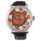 Laranja, preta e branca Artesia Bulldog "Pride" Watch com a máscara de Bulldog à cabeça sobre o tabuleiro branco e laranja. (Sempre que este Bulldog é visto sem os direitos autorais dos Designs do Skyrider, ele é roubado e só está disponível legalmente nesta loja)