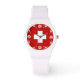 Você nunca precisará se preocupar com um compromisso com este relógio de na moda com a bandeira brilhante e alegre da Suiça com alguns edelweiss estilizados, uma das muitas flores nacionais alpinas da Suíça. Seja nas pistas de esqui ou desfrutando de uma pausa merecida com um dos deliciosos pratos nacionais suíços que se oferecem no bonito chalé suíço/restaurantes, este relógio certamente atrairá alguns comentários invejosos!