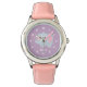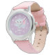 Um relógio com um desenho de um bebê elefante giro saltando pequenos corações cor-de-rosa do seu tronco. Fácil de ler cara de relógio casual. A cor de fundo pode ser alterada. Personalize com o nome da criança. Excelente como presente de aniversário ou de Natal para meninas.