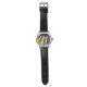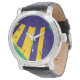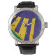 Não há muito subestimado neste relógio. O rosto apresenta um fundo azul com riscas douradas e uma dica de verde.